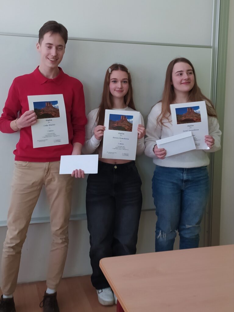 Soutěž byla složena ze tří částí: mluvení na vylosované téma, poslech na úrovni C1, a nakonec popis a porovnání obrázků. Díky své výřečnosti, důvtipu a šarmu si naše dvě děvčata zajistila ocenění. Sarah Opravilová (3. B) obsadila 3. místo a Dorota Komoňová (2. A) získala za svůj výkon 2. místo a postup do krajského kola soutěže.