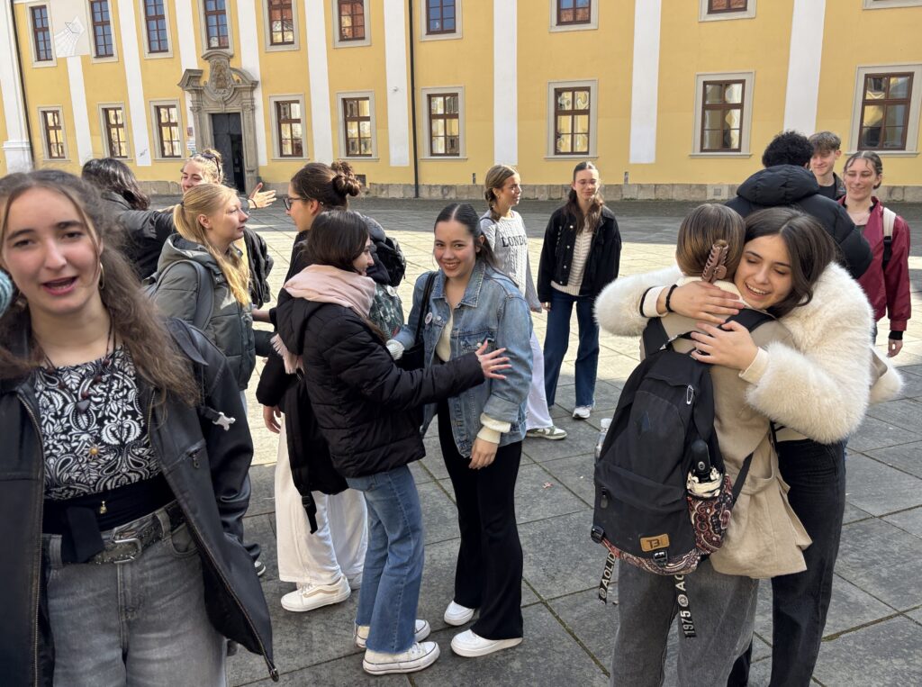 V pátek už jsme se ve školním vestibulu všichni společně setkali naposledy. Se sbalenými kufry po boku jsme si ještě chvíli popovídali a po příchodu pana ředitele a bouřlivém rozloučení s ním jsme se už museli začít loučit všichni. Chvíli to trvalo a emocí a objetí rozhodně nebylo málo, ale nakonec nastal čas zabouchnout kufry školních aut a s přáním šťastné cesty Španělům zamávat na rozloučenou.