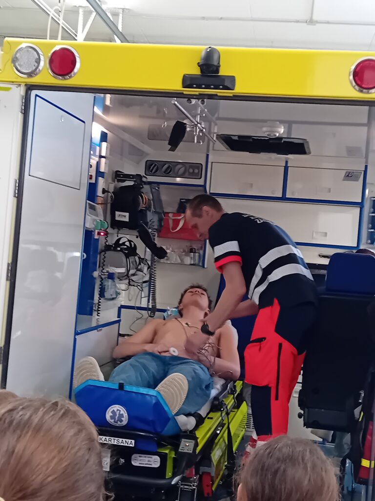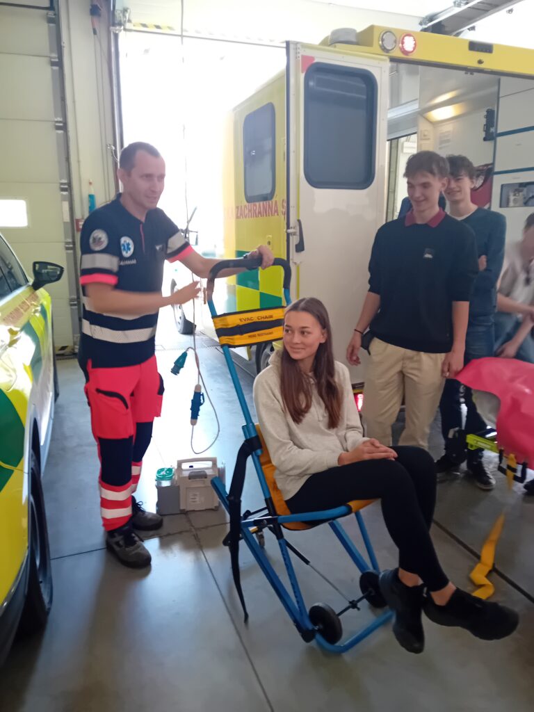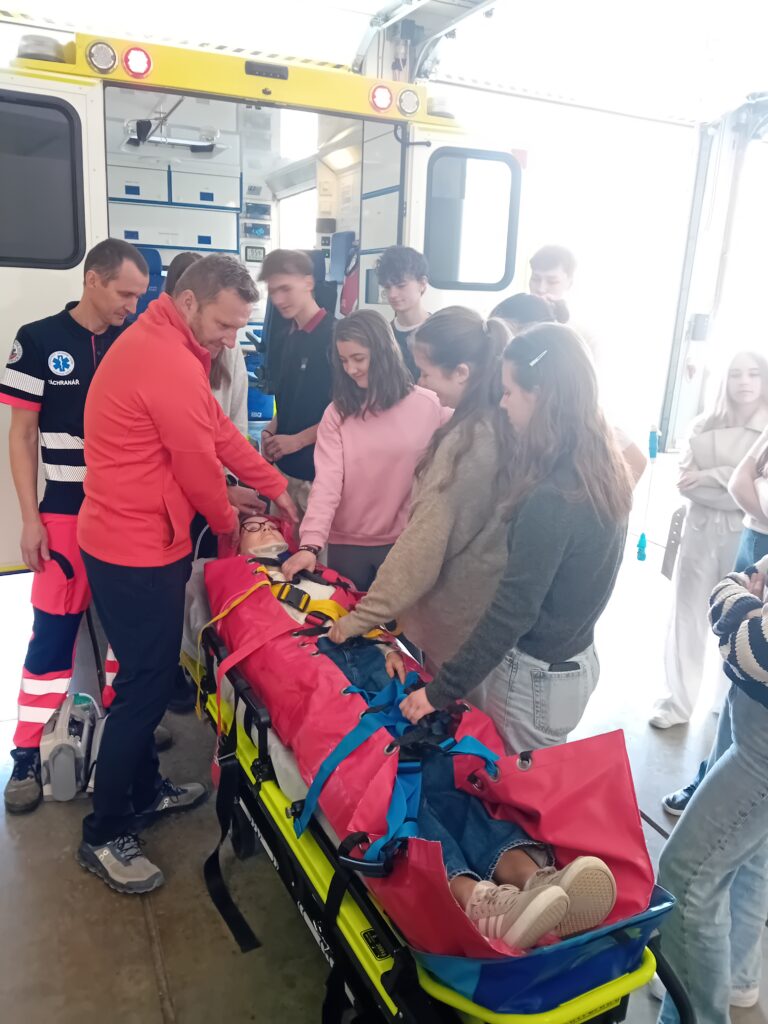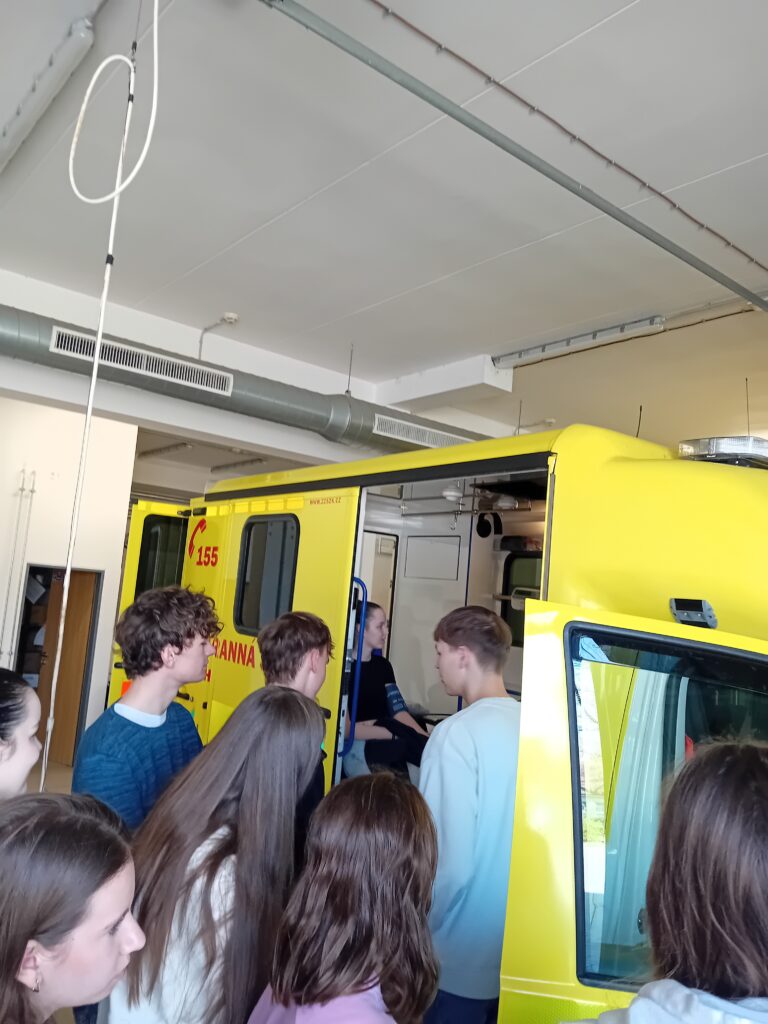 Záchranáři pan Jiří Vašica a pan Jiří Valenta nám ukázali sanitní vozidla a vysvětlili, jak fungují přístroje, které používají k záchraně životů. Představili nám také koordinaci mezi dispečinkem a posádkami, což je klíčové pro efektivní pomoc. Velmi působivé bylo, jak zvládají stres a spolupracují v týmu, aby co nejrychleji pomohli lidem v nouzi.