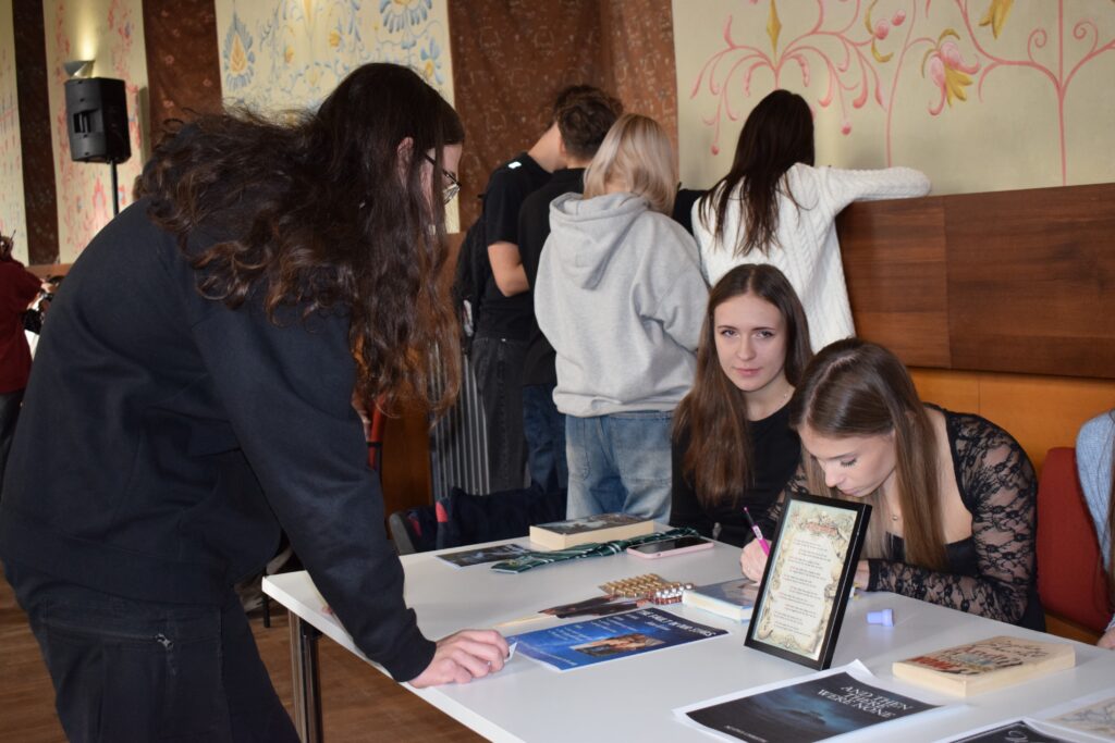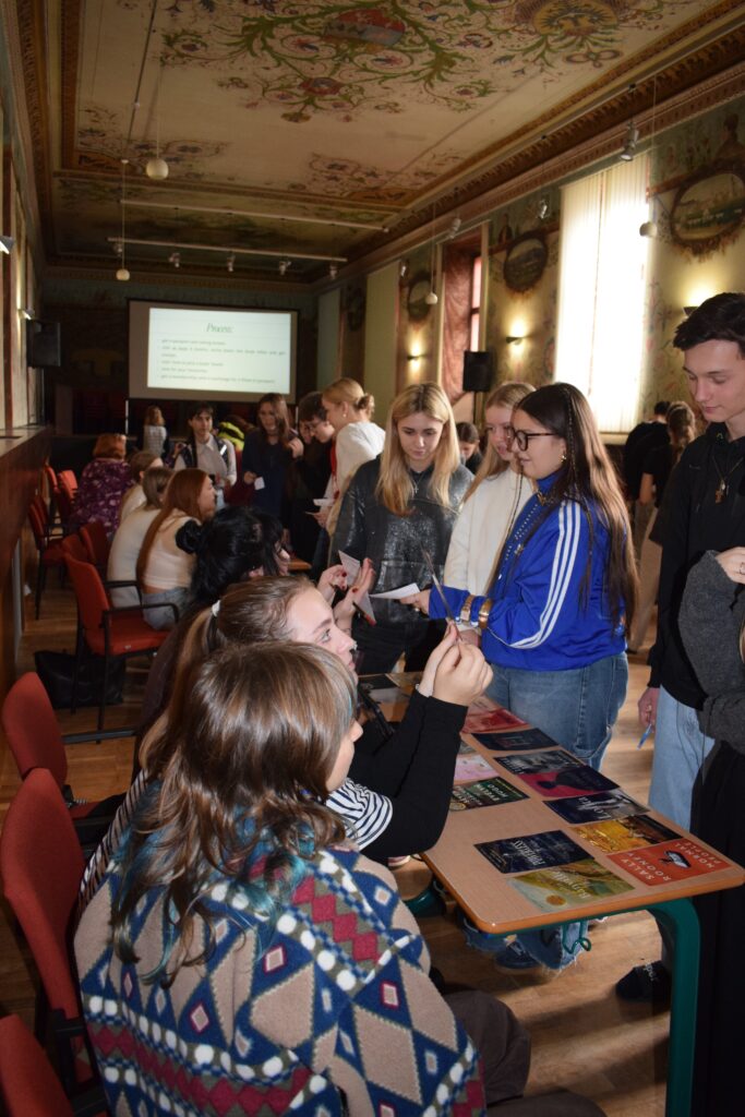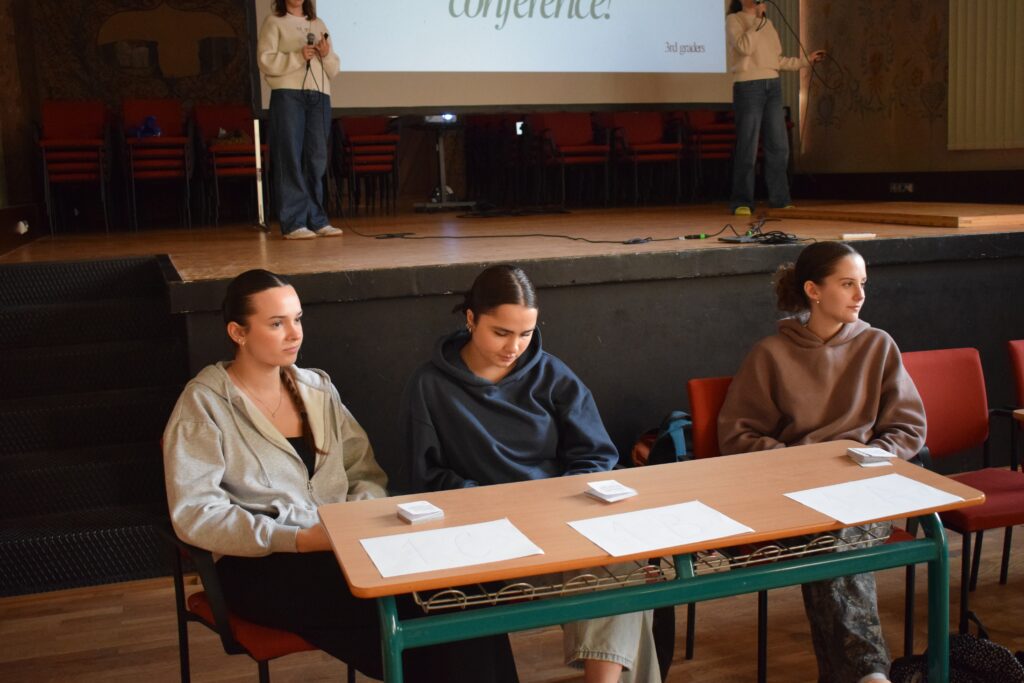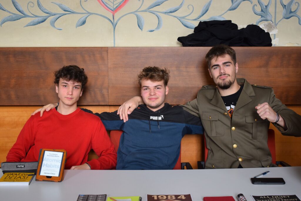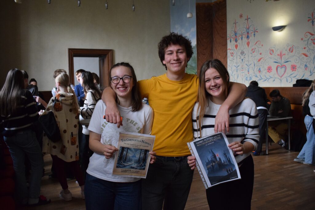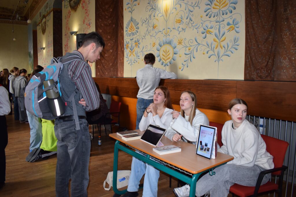On Friday, during the third period, students from the 1st and 3rd grades met in Slovan Hall for a book conference prepared by the 3rd graders. Each 3rd-grade student had chosen a book to read by December and then prepared an outfit or an object representing the book, a poster, and a short presentation about it. They set up their displays in Slovan Hall, and the 1st-grade students then mingled, listened to the presentations and evaluated each station, choosing their favourites in the categories of outfit/object, presentation and poster.