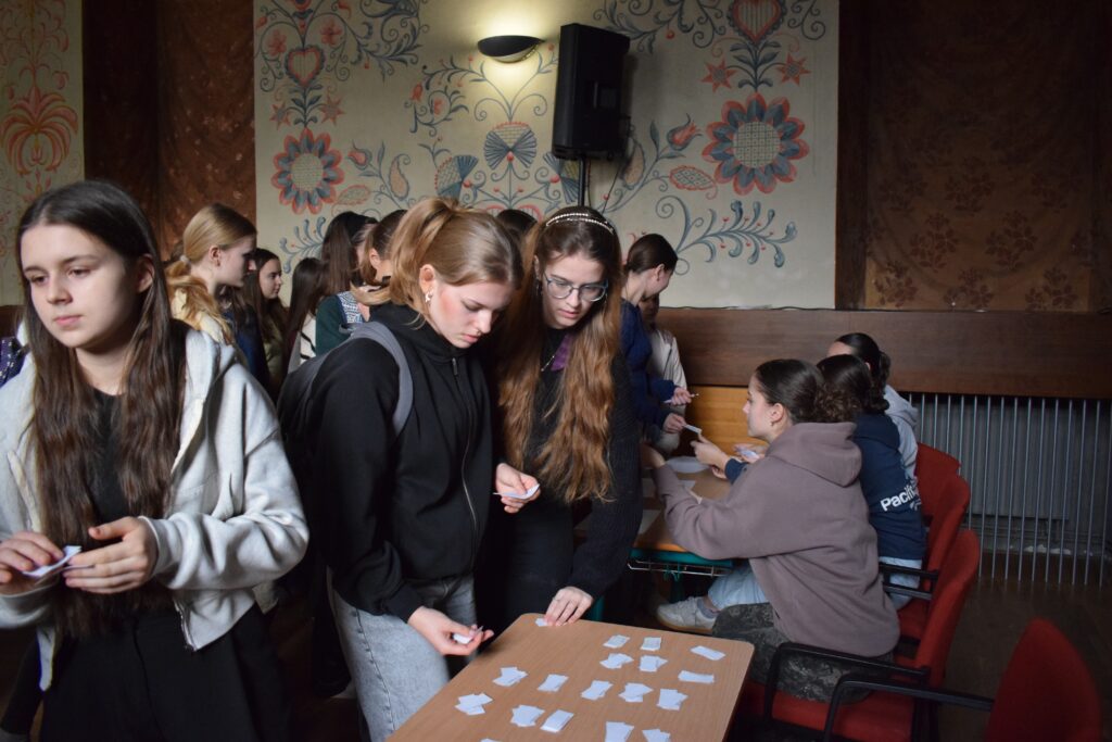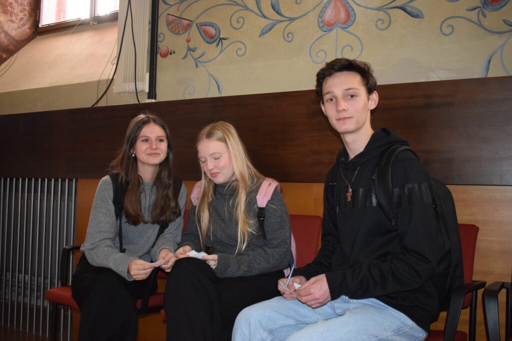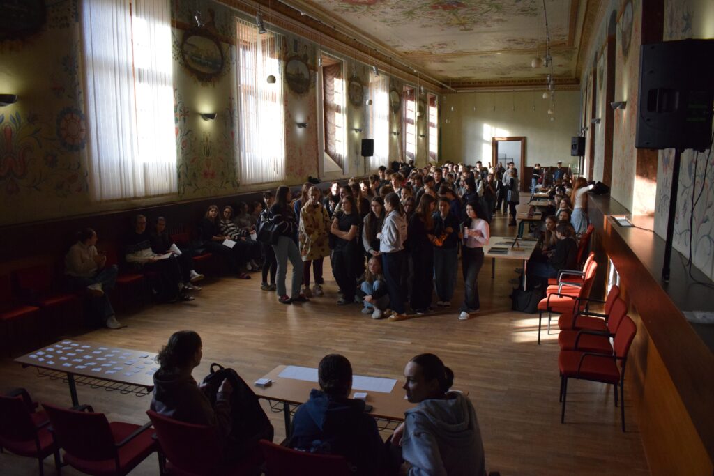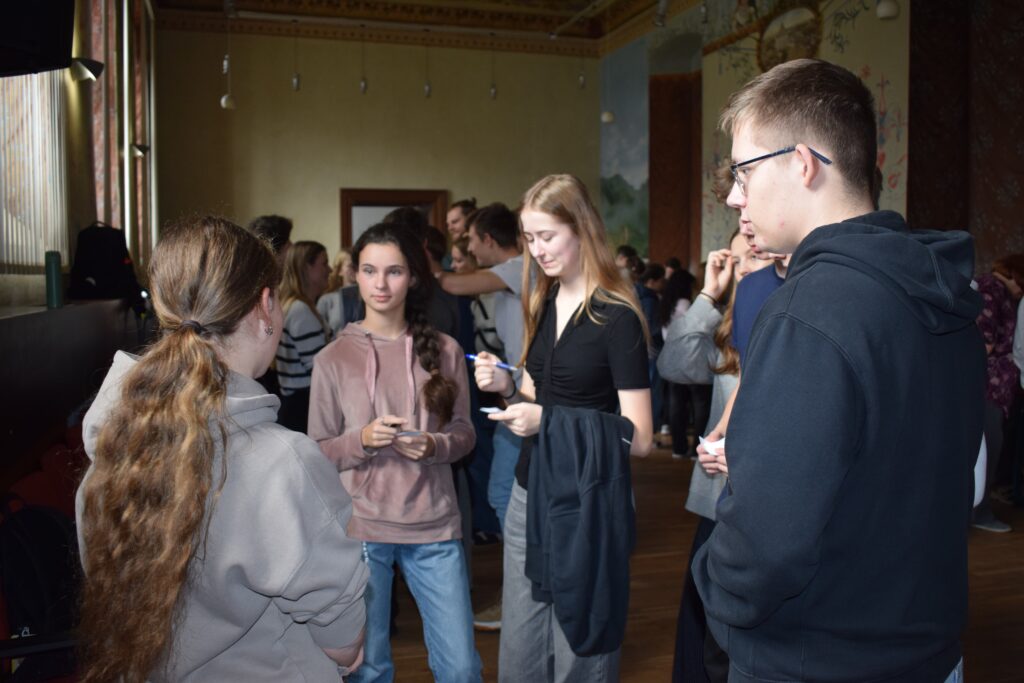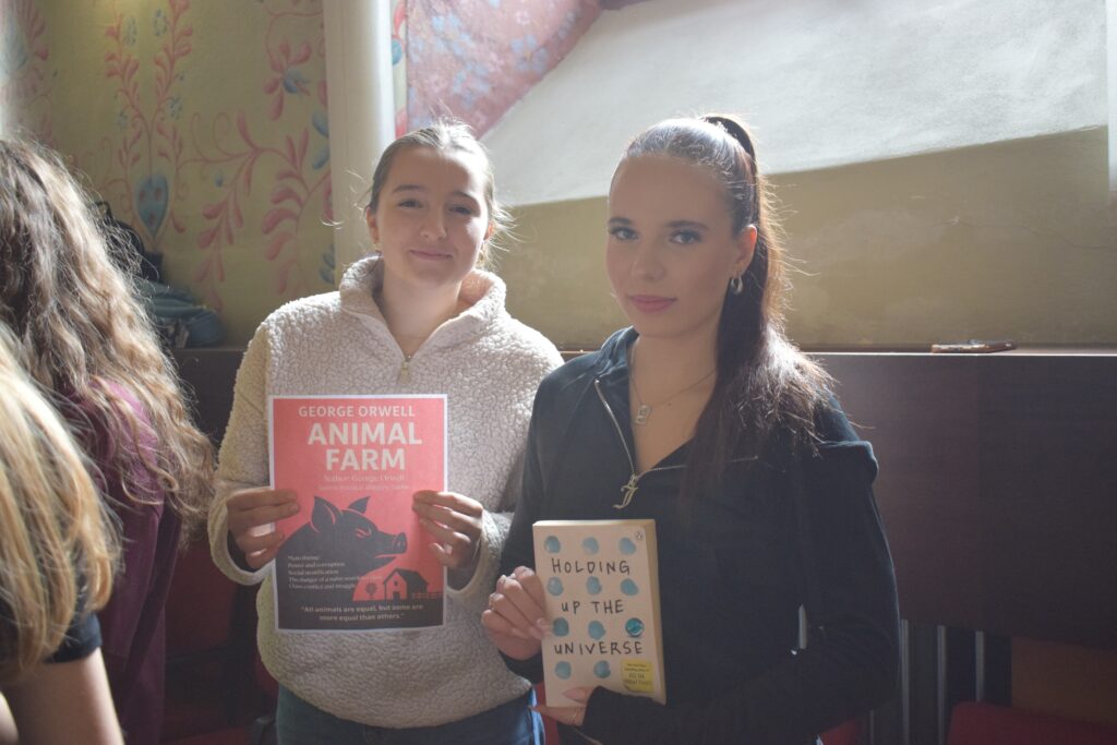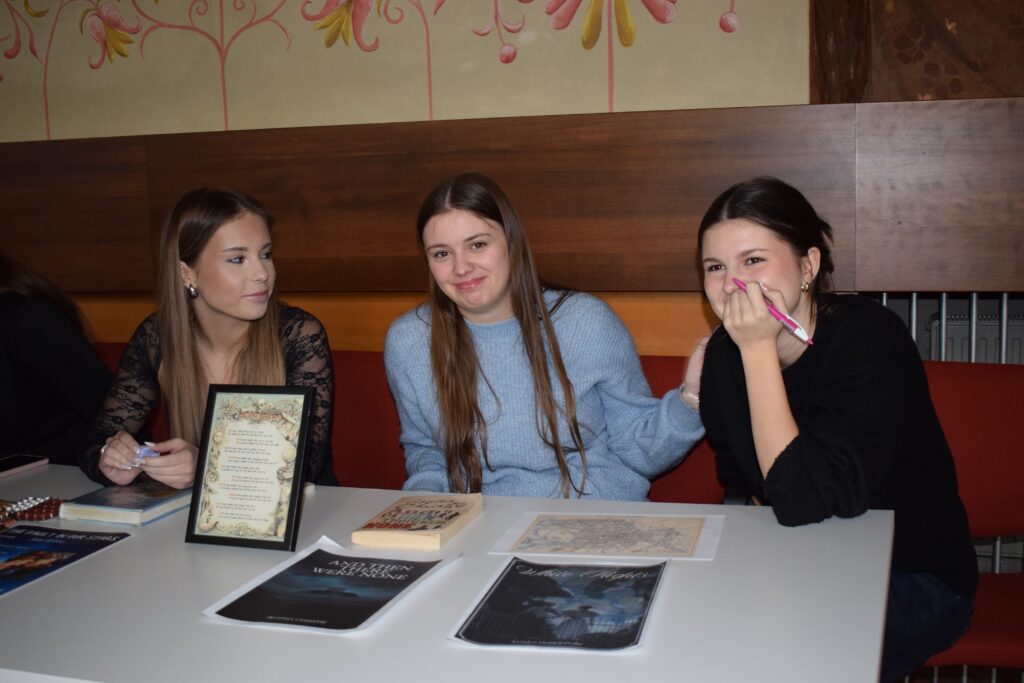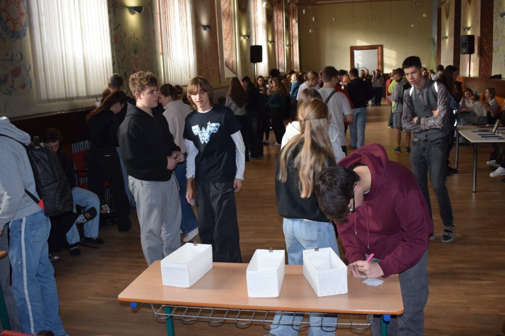 On Friday, during the third period, students from the 1st and 3rd grades met in Slovan Hall for a book conference prepared by the 3rd graders. Each 3rd-grade student had chosen a book to read by December and then prepared an outfit or an object representing the book, a poster, and a short presentation about it. They set up their displays in Slovan Hall, and the 1st-grade students then mingled, listened to the presentations and evaluated each station, choosing their favourites in the categories of outfit/object, presentation and poster.