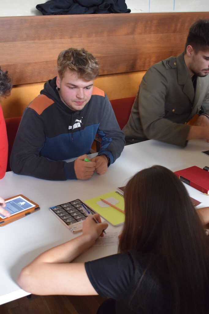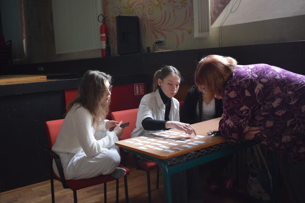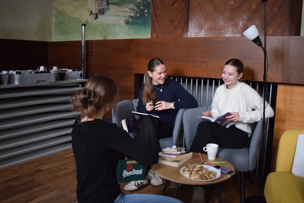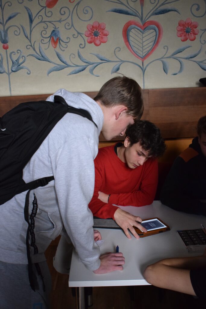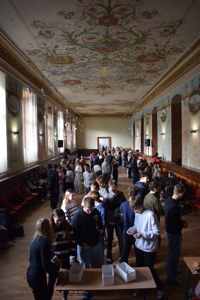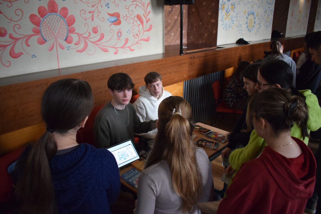 On Friday, during the third period, students from the 1st and 3rd grades met in Slovan Hall for a book conference prepared by the 3rd graders. Each 3rd-grade student had chosen a book to read by December and then prepared an outfit or an object representing the book, a poster, and a short presentation about it. They set up their displays in Slovan Hall, and the 1st-grade students then mingled, listened to the presentations and evaluated each station, choosing their favourites in the categories of outfit/object, presentation and poster.