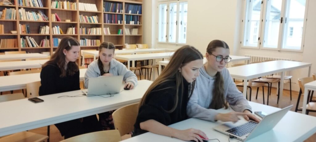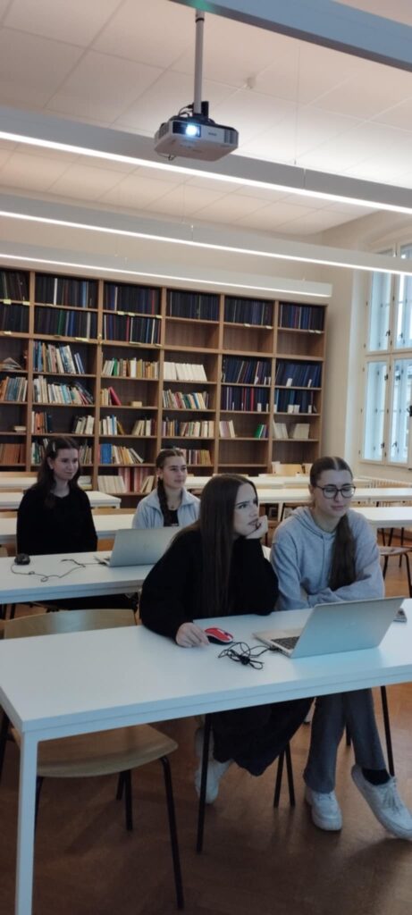 V dopoledním programu tak měly možnost blíže poznat chod katedry, získat řadu podnětných informací o možnostech studia i o aktuálním uplatnění absolventů na trhu práce. Po úvodním informačním bloku jsme si prohlédly Rakouskou knihovnu a poté nás čekala ukázková hodina věnovaná dabingu. Během výukové lekce si děvčata vyzkoušela převod filmových titulků z němčiny do češtiny a na závěr jsme se pobavily při překladu televizní reklamy do němčiny, v níž jsme se pokusily zachytit jazykovou hříčku.
