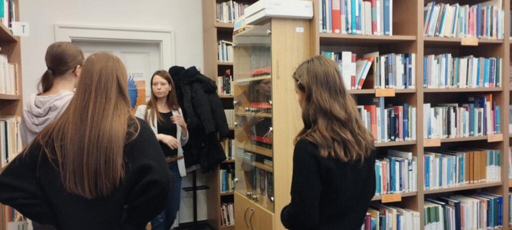 Po skončení návštěvy katedry jsme se připojily ke skupině francouzštinářů a společně jsme zamířili do Univerzitní knihovny. Následující hodina byla naplněna zajímavými informacemi o fungování této instituce a o široké nabídce poskytovaných služeb.