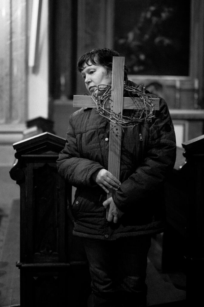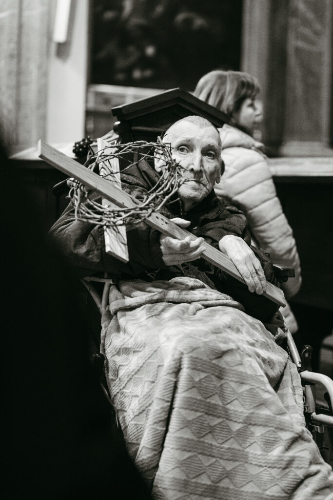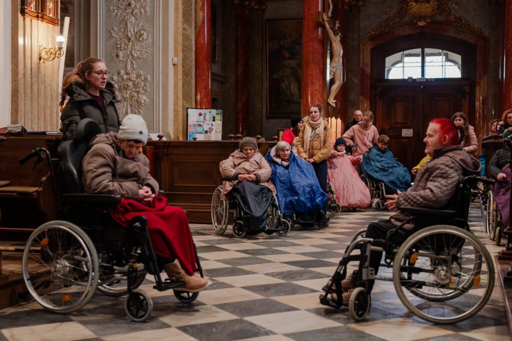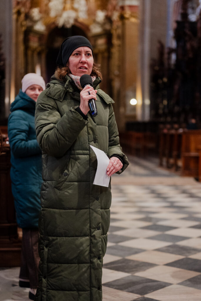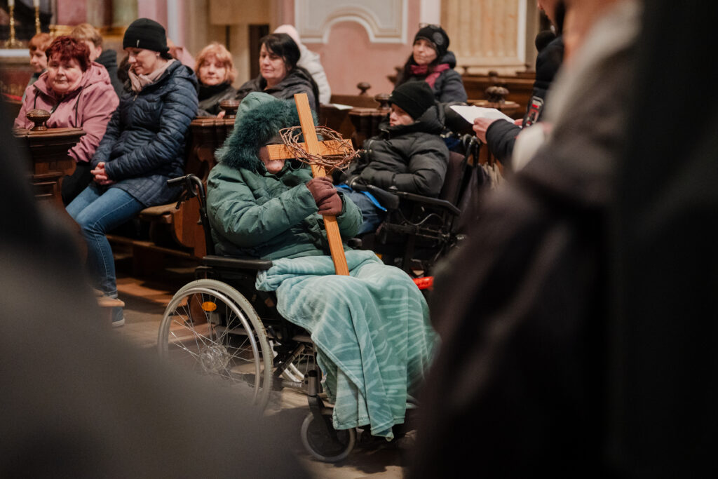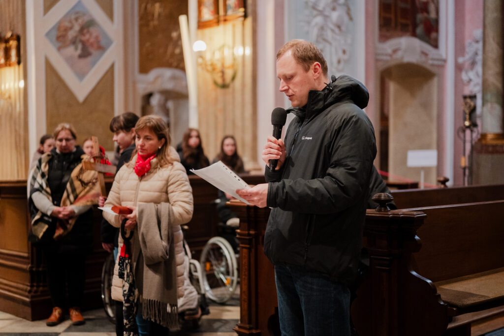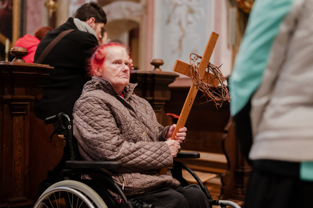 Při této křížové cestě se mi vždy vybaví obrázek Synody. Na něm všichni šli jedním směrem: řádová sestra, kněz, biskup, děti, staří lidé, lidé na vozíčku, a …, tak, jako naše společenství. Naše společenství tvořili lidé z farnosti, řádové sestry, lidé na vozíčku z DZP spolu s jejich ošetřovateli, studenti a zaměstnanci gymnázia, Matice velehradská, holky z chráněného bydlení. Zástupce každé z těchto institucí četl zastavení a lidé na vozíčku drželi při čtení kříž. Pro mě je to vždy radost z jednoty.
